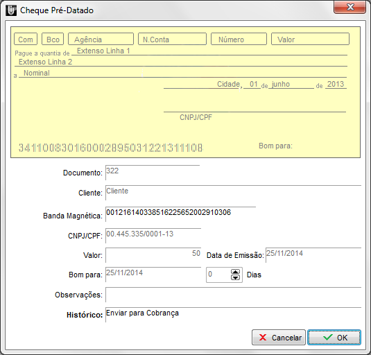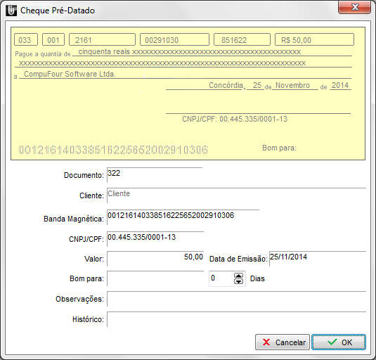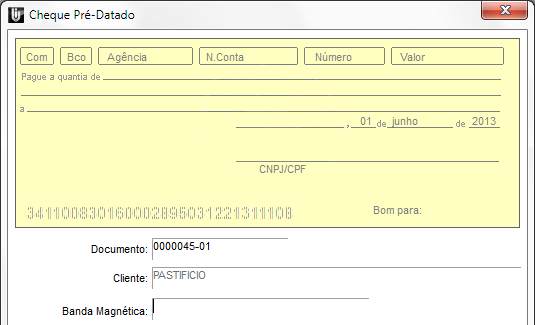 3. Digite o número/código CMC7 no campo Banda Magnética ou passe o cheque no leitor de cheques;