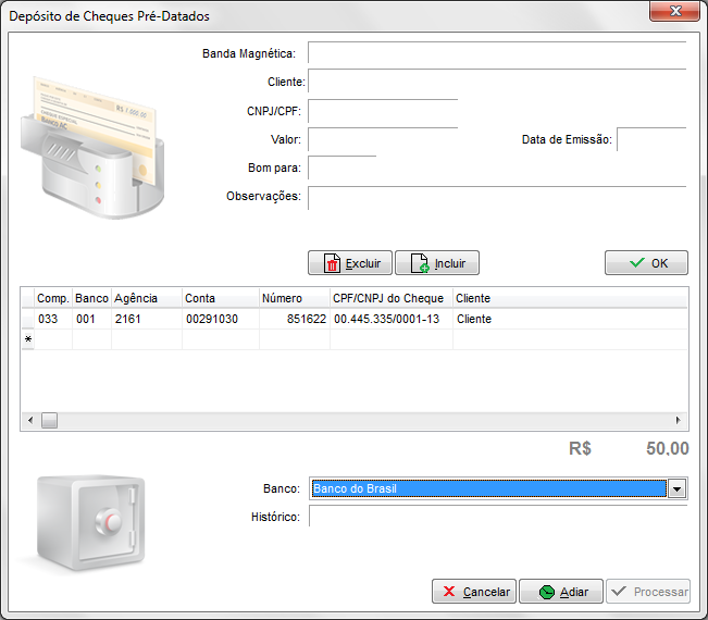 Ao clicar em “Gravar” será exibida a tela onde se pode efetuar o lançamento do cheque. Para fazer a identificação do cheque deverá digitar a banda magnética ou passar o cheque no leitor de cheques.