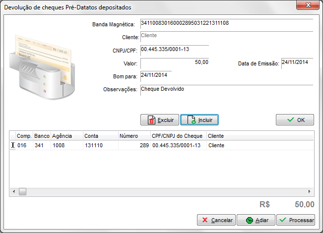 4. Serão apresentados os dados do cheque, confirme ou exclua o cheque da relação dos cheques a devolver;