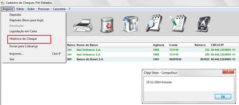 Selecionando o Cheque, clicando em Arquivo e após selecionando a opção Histórico do Cheque, irá informar toda a movimentação do Cheque.