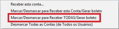 Caso algum boleto foi gerado por acidente e não deve ser considerado na remessa/arquivo de cobrança para transmissão, na versão 2019 do sistema é possível não enviar o(s) boleto(s) desejados. Basta localizar a conta para qual o boleto foi gerado, clicar com o botão direito na mesma e selecionar a opção Marcar/Desmarcar para Receber TODAS/Gerar boleto.