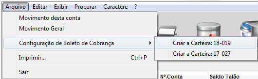 Acesse o módulo de Bancos e escolha o banco desejado, clique no Menu Arquivo / Configuração de Boleto de Cobrança, selecione a carteira disponível (poderá variar conforme o banco):