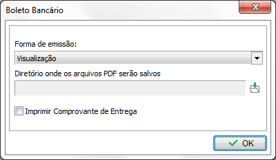 Para finalizar basta selecionar a forma de visualização, diretório onde os arquivos PDF serão salvos e também é disponível a opção para imprimir comprovante de entrega do boleto, após ajustar as opções desejadas pela Empresa, basta clicar em OK: