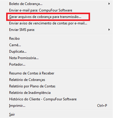 Para gerar o arquivo de cobrança dos Boletos com registro clique no Menu Arquivo / Gerar arquivo cobrança para transmissão: