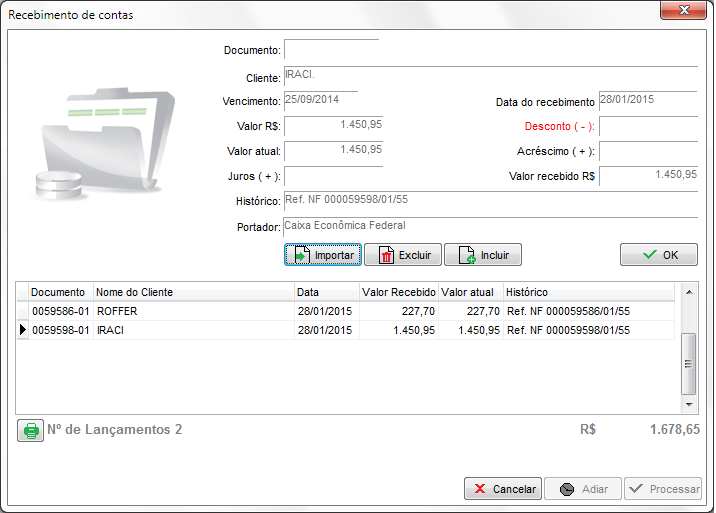 Neste momento serão listadas na tela as contas a receber correspondentes aos boletos recebidos e então poderá confirmar no OK e depois em Processar.