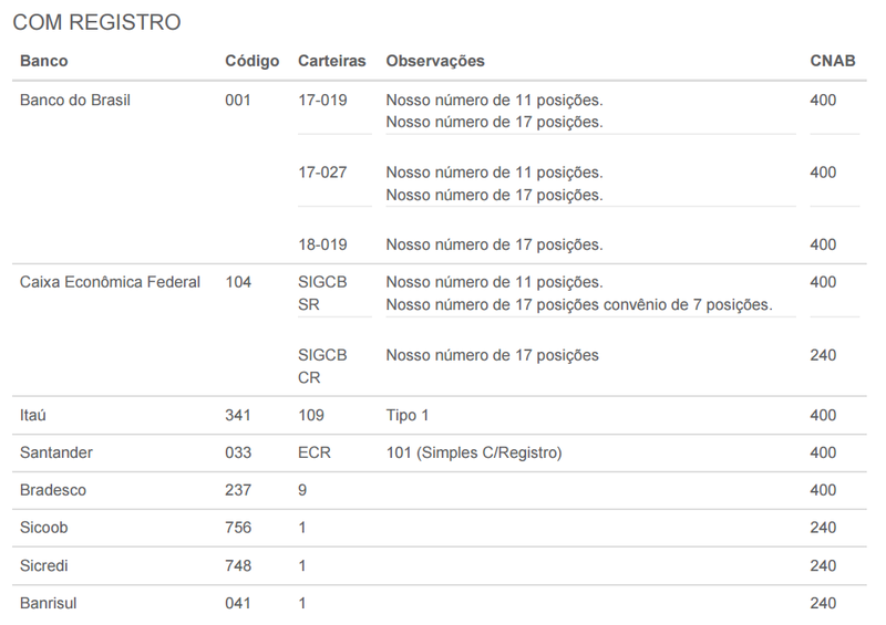 Abaixo é possível visualizar a listagem de Bancos e Carteiras que disponibilizam a emissão de boletos com registro.