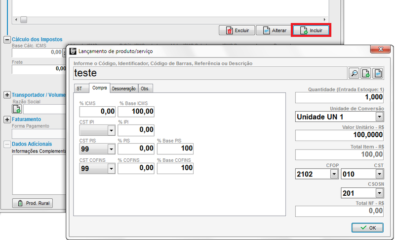 6. Após lançado o fornecedor agora serão lançados os itens na nota fiscal, nesse momento terá três Opções: