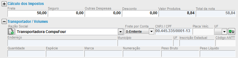 Dica: Para que o Frete seja somado ao valor total da nota fiscal é obrigatório preencher o campo do Valor do Frete, a Transportadora (com CNPJ) e o campo “Frete por conta” selecionar 0-Emitente.