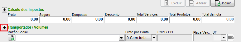 Para informar os dados sobre Transportador e Volumes transportados, clique sobre o botão “+” que fica ao lado dessa informação;