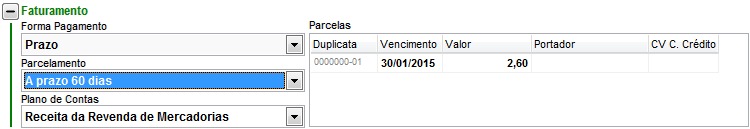 Após isso deve selecionar a opção de Fatura e Parcelamento, isso influenciará na geração da movimentação financeira, não existindo essa movimentação para seu caso selecione Nenhum para as duas opções.
