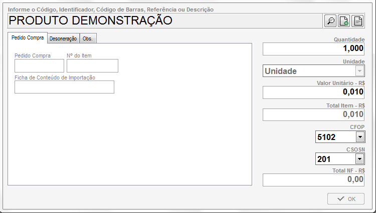 Clicando em Incluir poderá informar os itens que devem constar nessa nota, da mesma forma que para o Cliente, caso não tenha o item cadastro em seu estoque, caso pressionar INSERT na tela de lançamento do item será aberto o cadastro de um novo item.