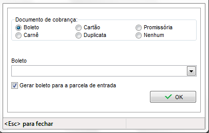Caso seja selecionado um tipo de parcelamento que requer entrada, será opcional imprimir o boleto para a parcela de entrada.