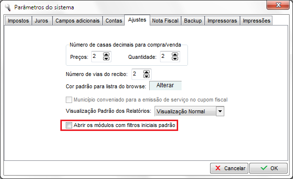Para deixar os filtros desativados e exibir todas as informações que possui no módulo, acesse Configurações > Parâmetros > Ajustes e desmarque a opção "Abrir os módulos com filtros iniciais padrão", conforme imagem abaixo:
