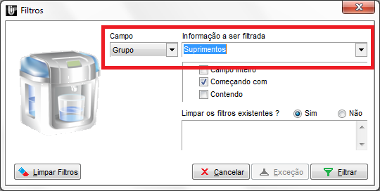 Um exemplo: Precisamos da listagem de um determinado Grupo de produtos. Primeiramente é necessário limpar os filtros, clicando no ícone Filtrar / Limpar filtros, ou através do atalho (F6).