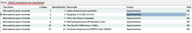 Serão apresentados na listagem somente os produtos do grupo “Suprimentos”.