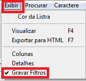 Caso desejar que o filtro que irá realizar fique padrão para quando entrar no módulo, clique no Menu Exibir e deixe selecionada a opção Gravar Filtros, conforme imagem abaixo: