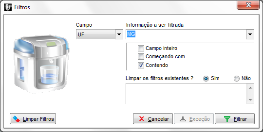 Nesta opção pode-se ocultar alguma informação, por exemplo, efetuamos um filtro no controle de clientes para listar todos os clientes de MG exceto os da cidade de Belo Horizonte, neste caso primeiramente criamos um filtro selecionando o campo UF e informando MG como na figura abaixo: