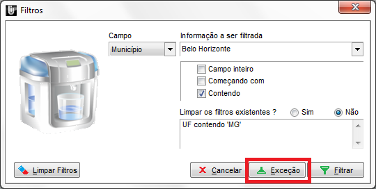 Após filtrar clique novamente na opção Filtrar do estoque, selecione o campo Município, Informe Belo Horizonte e na opção Limpar filtros existentes marque a opção “Não". Nesse momento habilitará o botão Exceção.