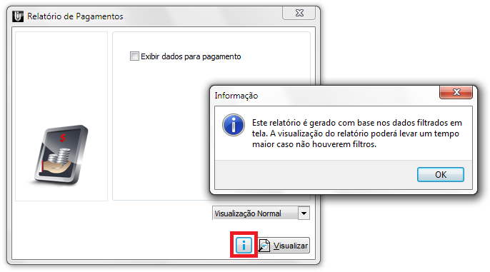 DICA: Vários relatórios do sistema obedecem aos dados filtrados em tela. Por exemplo, podemos observar o Relatório de Pagamentos disponível no menu Arquivo do Contas a Pagar, existe o botão de Informação, clicando no mesmo será exibida a mensagem informando que o relatório será gerado com base nos Filtros.