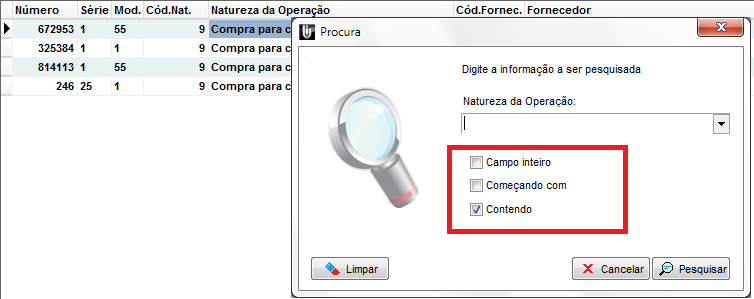 Feito isso, ao abrir uma nova Nota de Compra por exemplo, a pesquisa será mantida para todos os campos da nota: