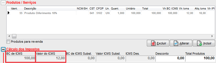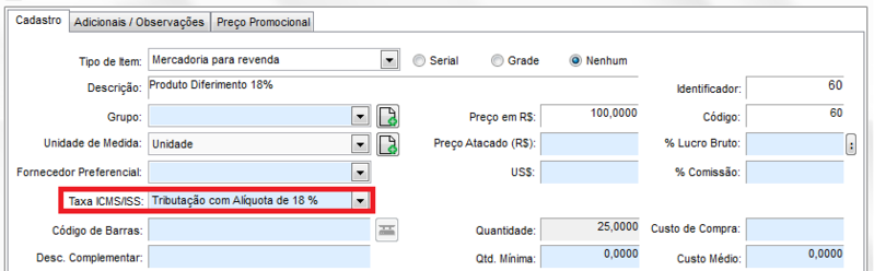 Assim, os produtos que tiverem 18% de tributação receberão automaticamente o diferimento, nesse caso não há a necessidade efetuar nenhuma outra configuração. Veja o cadastro do produto como deve ficar: