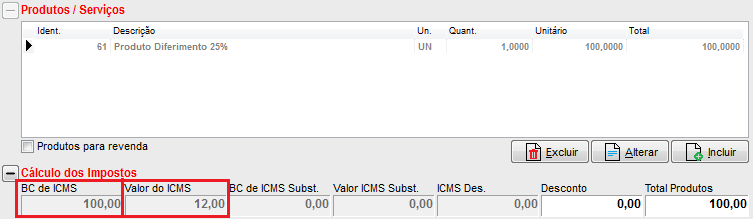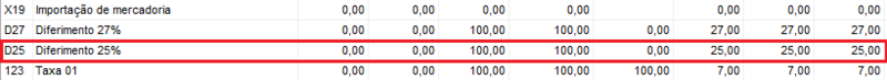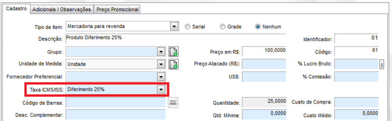 Para os produtos que tiverem 25% de tributação, para o sistema aplicar o diferimento deverá ser configurado (cadastrado) no campo Taxa ICMS/ISS no cadastro do produto, a informação Diferimento 25% (que já deve estar cadastrada na tabela de taxas).