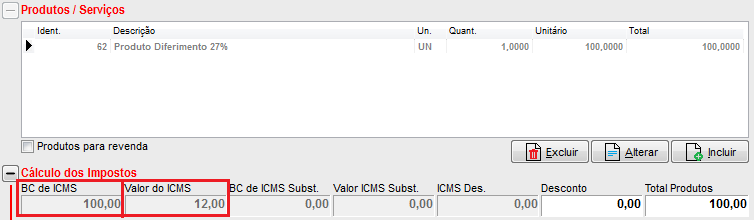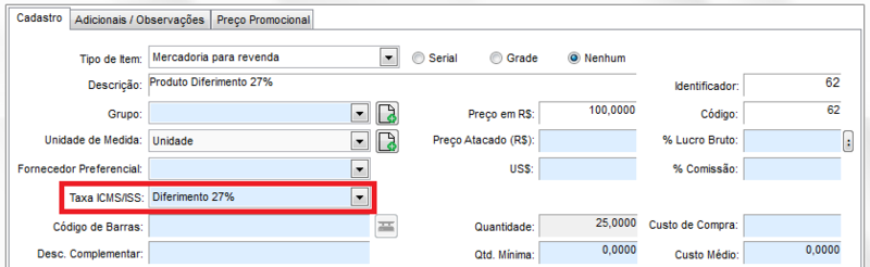 Para os produtos que tiverem 27% de tributação, para o sistema aplicar o diferimento deverá ser configurado (cadastrado) no campo Taxa ICMS/ISS no cadastro do produto, a informação Diferimento 27% (que já deve estar cadastrada na tabela de taxas).