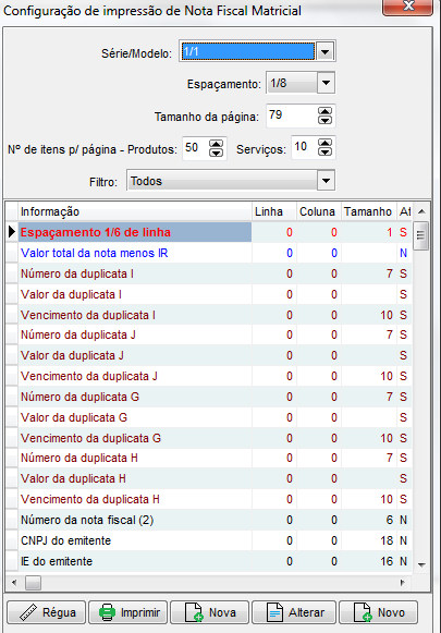 O próximo passo para configurar sua Nota Fiscal é imprimir uma régua. Para imprimi-la,acesse o módulo Configurações / Nota Fiscal. Na parte inferior desta janela é encontrado o botão Régua. Pressionando-o, será impressa a régua de configuração.