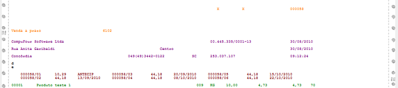 Para imprimir informações com Caracteres comprimidos (geralmente os produtos são impressos assim), localize a linha onde se encontra a primeira informação que será comprimida e configure uma linha antes a informação Caractere comprimido. Para voltar a imprimir normal, configure a informação Caractere normal uma linha antes da informação onde voltará a imprimir Caracteres normais.