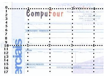 Se baseando no exemplo acima, a informação Natureza de operação deveria ser configurada na linha 5 e coluna 9. A próxima informação, CFOP, deveria ser configurada na linha 5 coluna 31. Razão social do cliente, linha 7, coluna 9. CPF ou CNPJ do cliente na linha 7, coluna 51. Perceba que com a impressão da régua sobre o seu modelo de nota Fiscal, a configuração se torna mais simples, basta apenas indicar ao programa a posição (linha e coluna) de cada informação. Para a informação desejada ser impressa mais para baixo, basta aumentar o valor configurado na linha da mesma e caso deseja subir, basta diminuir esse mesmo valor. Além disso, a coluna também pode ser alterada posicionando a informação mais à esquerda (diminuindo o valor do campo) ou mais à direita (aumentando o valor), porém sempre respeitando o limite de Caracteres disponíveis na impressora.