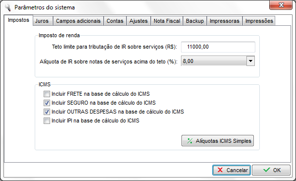 Teto limite para tributação de IR sobre serviços (R$): Para empresas que possuem calculo de IR sobre serviços , exite um limite mínimo para que este imposto seja destacado na nota fiscal. Podemos configurar esse limite através desta opção.