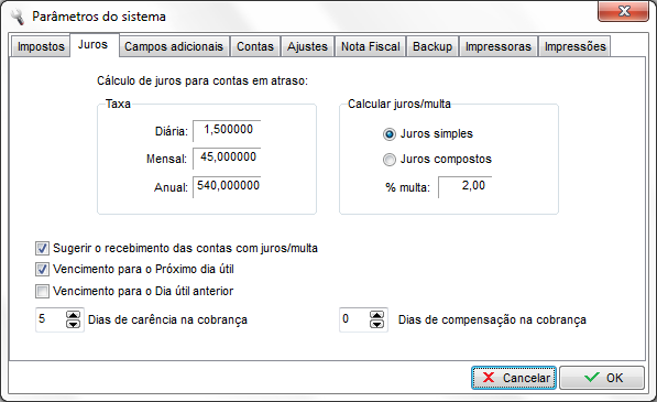 Dias de carência na cobrança: Essa opção indica ao sistema a quantidade de dias que uma parcela em atraso não sofrerá acréscimo de juros.
