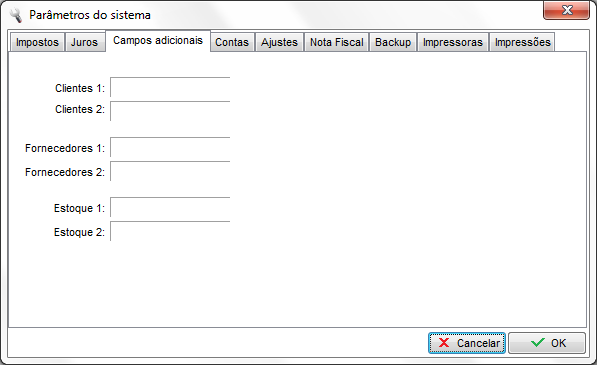Esta opção possibilita a criação de mais dois campos para os módulos de Clientes, Fornecedores e Estoque. Ao digitar um nome para os campos, automaticamente irão aparecer nos cadastros e poderão ser preenchidos com qualquer informação. Estes dois campos também irão aparecer nos relatórios ao exportar os cadastros.