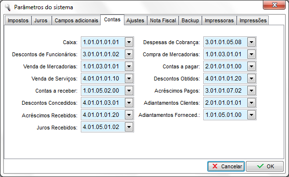 Este módulo organiza os lançamentos efetuados no sistema tais como lançamento de notas, contas a receber e pagar, desconto de funcionários, entre outros. Esse plano de contas pode ser totalizada por um determinado período informado pelo usuário ou totalizar deste o inicio da utilização do sistema e auxílio na geração de relatórios tais como Relatório do plano de contas, Balancete por período ou saldo das constas, entre outros. As configurações desse plano de contas já vem pré-definido na instalação do sistema, caso precise efetuar alguma alteração, consulte seu contabilista.