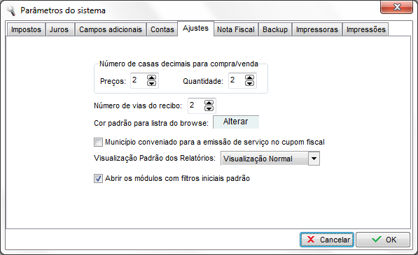 Este módulo permite personalizar certas operações do sistema, tais como: configuração de nota fiscal e matricial, tabela de ICMS/ISS, período de intervalo e duplicatas, entre outras. Também permite cadastrar os dados do emitente, licença de uso e definir permissões de usuários.
