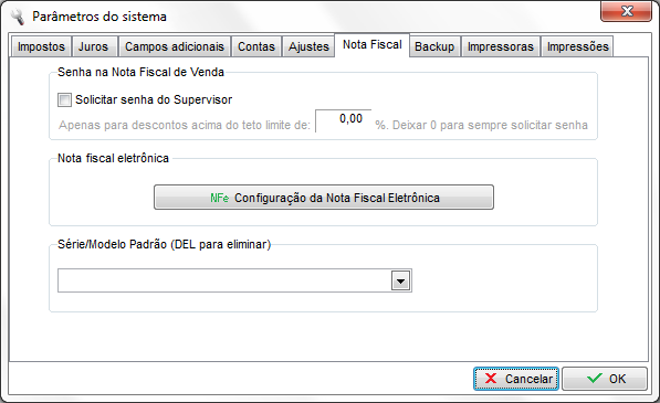Série/Modelo Padrão (DEL para eliminar): Informar a série e modelo padrão para emissão de nota fiscal.
