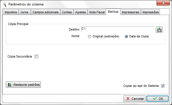 O Clipp Store, possui uma eficiente ferramenta para realizar o backup (cópia de segurança) dos dados. No arquivo de backup gerado estão todos os arquivos referentes ao banco de dados e configurações, na tela a seguir é possível efetuar a configuração para o backup. Atualmente o backup pode ser realizado em dois locais diferentes, basta efetuar a configuração primeiramente na cópia principal e após na cópia secundária.