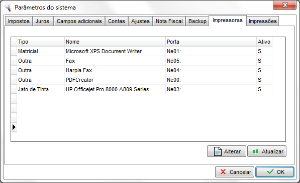 Nesse local serão informadas as impressoras instalados no computador, sendo que será necessário configurar o tipo de cada umas das mesmas. Para configurar o modelo da impressora, dê um duplo clique sobre a mesma ou selecione e clique no botão “Alterar” e será mostrada a tela abaixo: