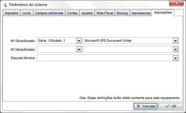 No campo NF.Série/Modelo informe a série e modelo que esta sendo utilizado para efetuar as notas fiscais em seguida no campo ao lado, informe a nome da impressora.