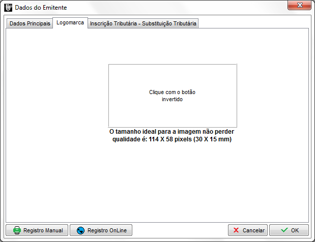 Nesta tela poderá informar a logomarca da empresa, para isso clique com o botão invetido do mouse no retangulo, em seguida clique em “Procurar foto” ou “Capturar foto (webcam)” para inserir a imagem. Lembrando que para imagem não perder qualidade sugerimos que o tamanho seja de 114 X 58 pixels (30 X 15 mm).