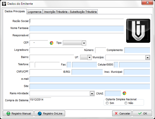 Esta opção permite cadastrar ou alterar os dados do emitente (usuário do sistema). Estes dados são usados nos títulos de relatórios, na emissão das notas fiscais, nos cálculos de ICMS, etc.