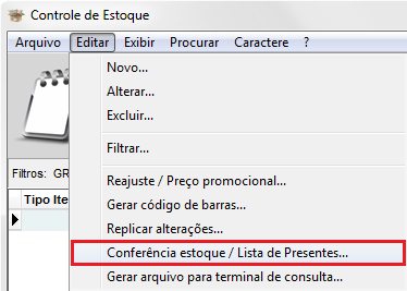 Para gerar o relatório de Diferença de Estoque, basta acessar o Módulo de Estoque – Menu Editar - Conferência de Estoque/Lista de Presentes.