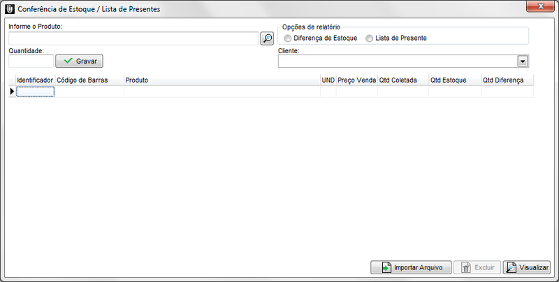 Será permitida a importação do arquivo gerado por um Coletor de Dados, através do qual serão identificados os códigos de barras e as quantidades de seus produtos. Caso deseje buscar o arquivo gerado pelo coletor de dados, na parte inferior da tela clique sobre o botão Importar Arquivo e localize o arquivo TXT, serão exibidos os itens e suas quantidades no relatório.