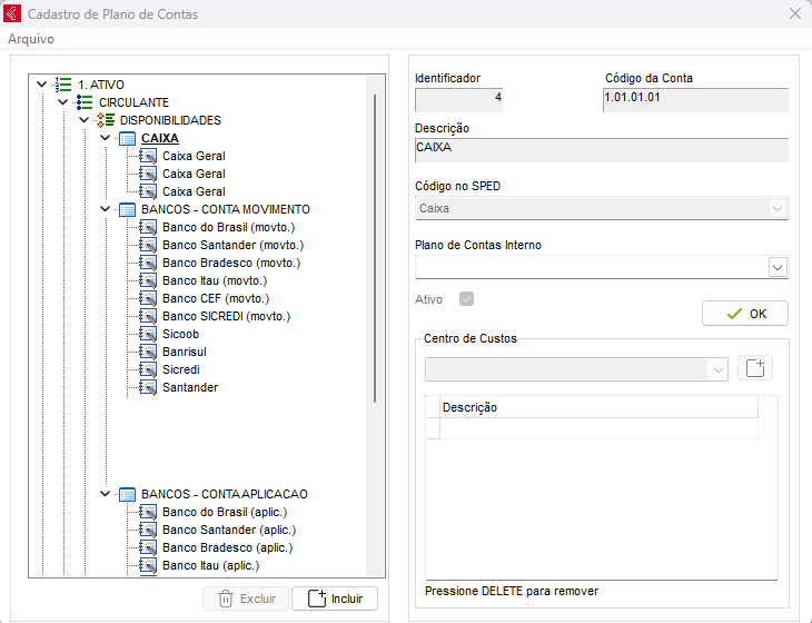 Para o cadastro de um plano de contas interno, caso queira ter um controle do mesmo, pode ser cadastrado na mesma tela, mas pressionando no botão Arquivo > Cadastrar plano de contas interno