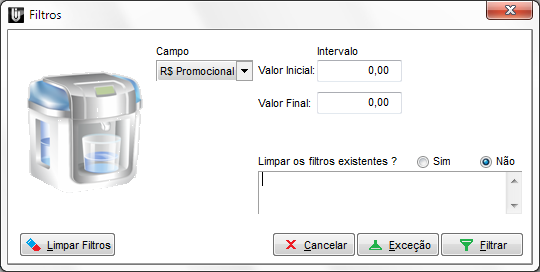 Marque em: Limpar os filtros existentes = NÃO. Obs: Mantendo a opção "Não" marcada, a exceção será aplicada somente aos produtos já filtrados na tela, caso desejar gerar as etiquetas para todos os itens do estoque, antes de configurar a exceção, limpe os filtros.