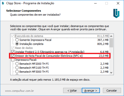 Caso durante a instalação do Clipp Store tenha desmarcado a opção de instalação da Nota Fiscal do Consumidor Eletrônica, reinstale o mesmo através do CD marcando esta opção.