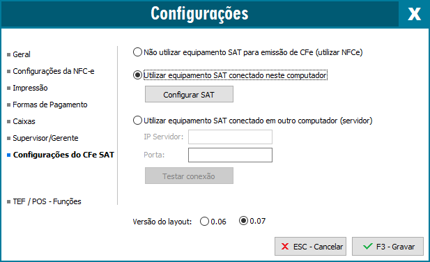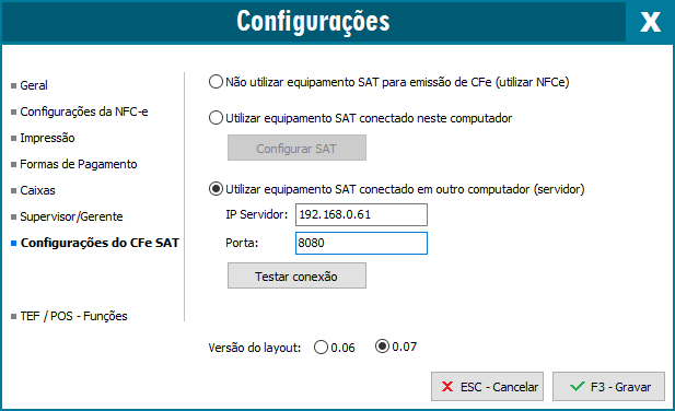- Abra o Módulo de CFe SAT - Menu Configurações - guia Configurações do CFe SAT - marque a opção: Utilizar equipamento SAT conectado em outro computador (servidor)