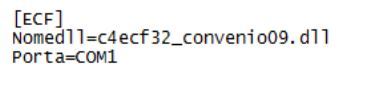 Localize o arquivo “c4ecf.ini”, abra o mesmo, confira se o nome da dll está indicado como: “Nomedll=c4ecf32_convenio09.dll”, e a porta deve estar igual a porta identificada no gerenciador de dispositivos. Caso não estiver, efetue as alterações necessárias.