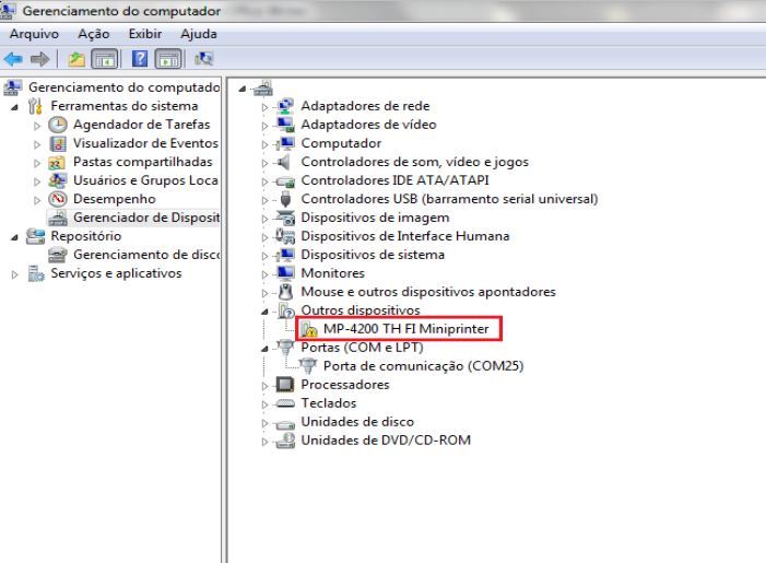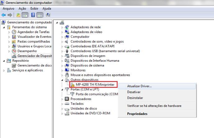 No gerenciador de dispositivos do Windows, clique com o botão direito do mouse, sobre o driver pendente de instalação (MP-4200 TH FI Miniprinter) e em seguida, clique em “Atualizar Driver”: