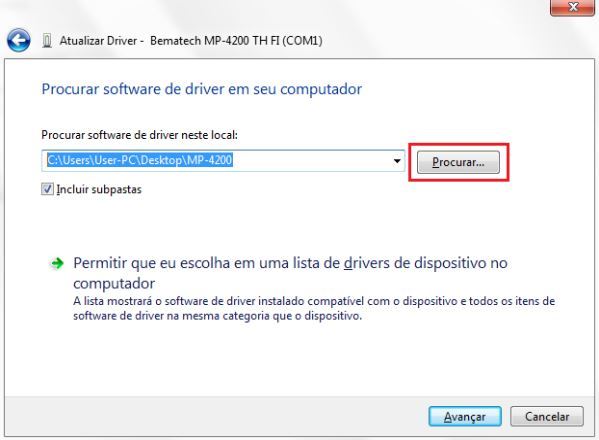 Na próxima janela, clique no botão “Procurar”, e defina o caminho para onde o driver foi baixado e em seguida clique em “Avançar”:
